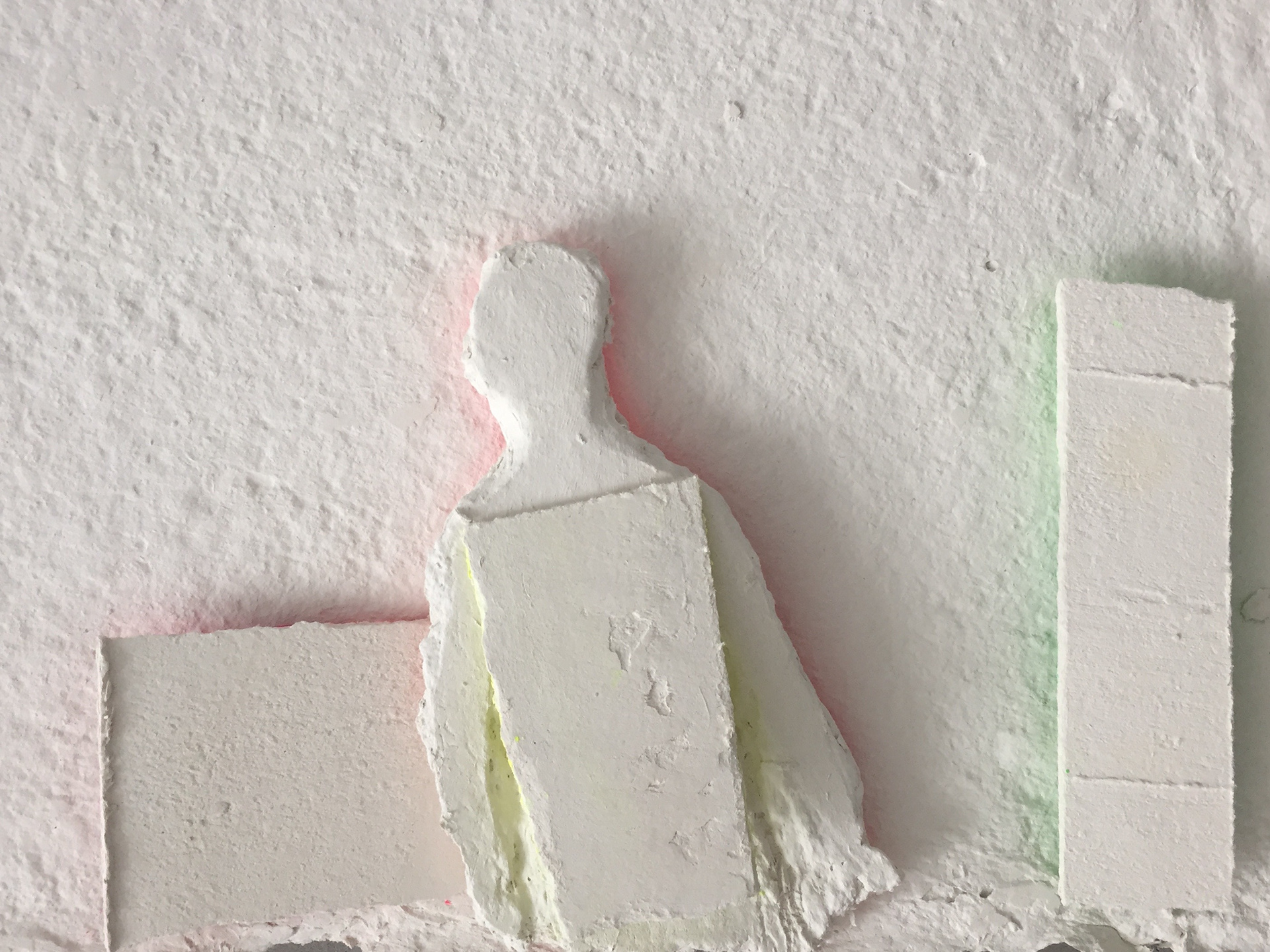 A spiritual pilgrimage in parallel realities. The knapsack, the sail boat with a feather sailing to the dock. The feather takes reads dreams, messages, composes poems, music, etc. Windows to open and close. After a while, my inner eye attunes to the colored shadow light in a new way. Rosette Gault, Wall work About 20" x 30" Porcelain paperclay fired, with auras. Exhibited Banff Center Project Space, 2019